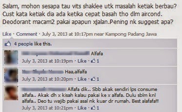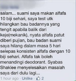 - Alfalfa ramai yang telah akui keberkesanannya. Alhamdulillah. caranya amat senang, cuma tablet yang sedia untuk ditelan atau di rendamkan didalam air. Kenapa mesti Alfalfa? Alfalfa mengandungi klorofil , ia mampu nyahkan toksin yang menyebabkan bau ketiak kita. Jika kita konsisiten mengambil alfalfa, bau ketiak akan beransur-ansur hilang. In Shaa Allah.