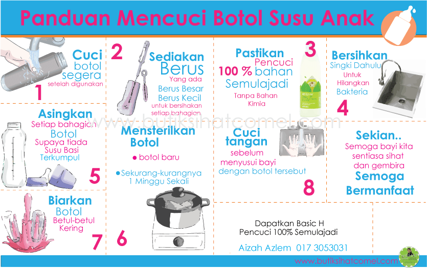 Kebersihan amat penting dalam menguruskan bayi kita , jangan abaikan kebersihan dan juga amat penting dan perlu kita menggunakan bahan pencuci tanpa kimia untuk mencuci botol-botol bayi kita supaya bayi kita dihindari daripada sebarang masalah kesihatan.