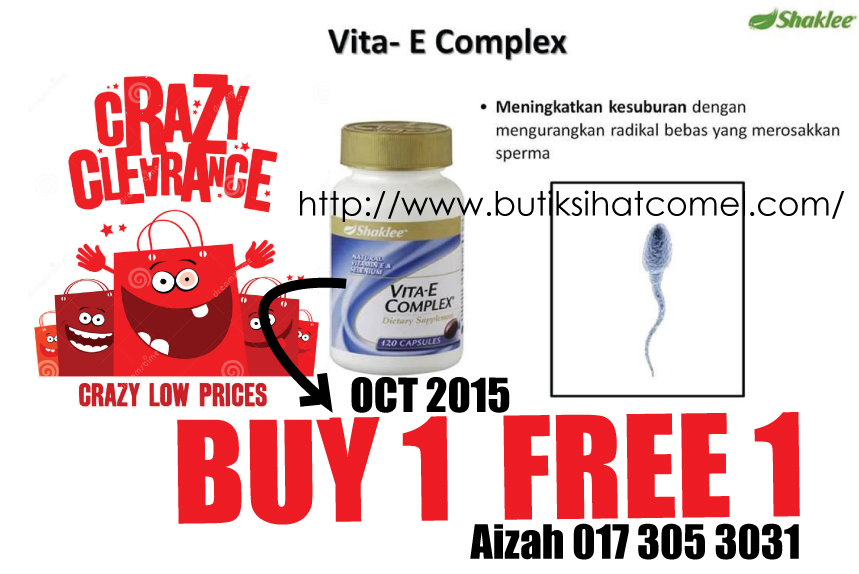 - Dan bertuah anda pada bulan October 2015 ini, kerana Shaklee membuat promosi clearance stok Vitamin E , BUY 1 FREE 1 ! amat murah dan berbaloi . Selain itu senang , boleh terus makan sahaja sebiji sehari sebelum tidur. Ada juga yang gelarkan Vitamin E ini sebagai ubat kuat suami dan tingkatkan kesuburan .