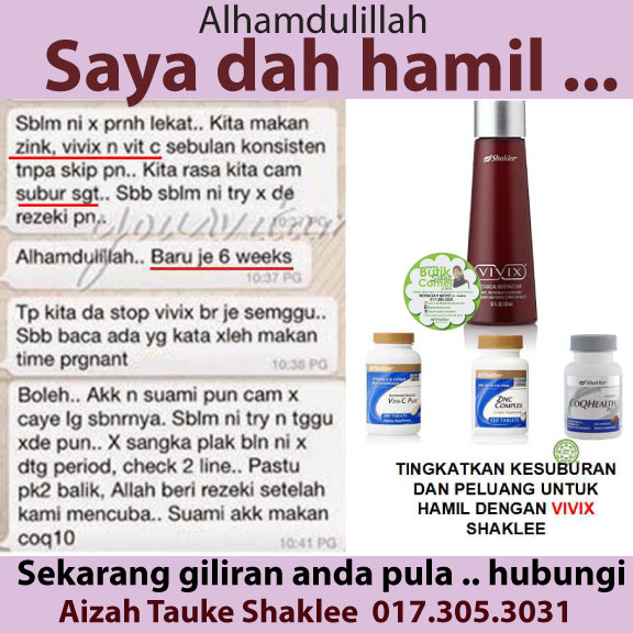 Semoga entri ini boleh membantu anda lebih mudah untuk menimang cahaya mata 🙂 Pilihan ditangan kita dan pasangan kita, mungkin dengan ambil langkah amalkan vitamin E dan Zinc untuk suami lebih subur dan isteri juga perlu menjaga kesuburan, semoga Allah membukakan jalan untuk mendapat zuriat seperti mereka yang telah mencubanya :-