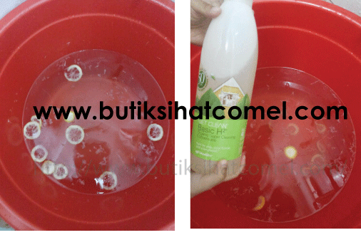 - Ambil secawan air suam , perahkan lemon tadi dan titiskan 2 titik Basic H ke dalam air,seterusnya hirisan lemon di rendam.