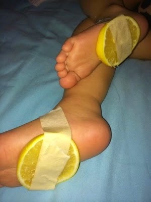- Ambil hirisan lemon yang dah direndam tadi , masukkan ke dalam stokin dan pakaikan pada anak.