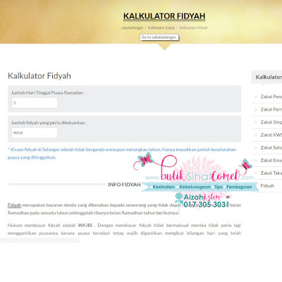 1) kita boleh pergi ke Laman page zakat selangor ( http://www.zakatselangor.com.my/calkulator-zakat/kalkulator-fidyah/ ) , dekat sini zakat selangor sudah sediakan cara pengiraan auto seperti gambar di bawah . masukkan jumlah hari kita tinggalkan puasa akan auto keluar berapa kita yang kita perlu keluarkan fidyah