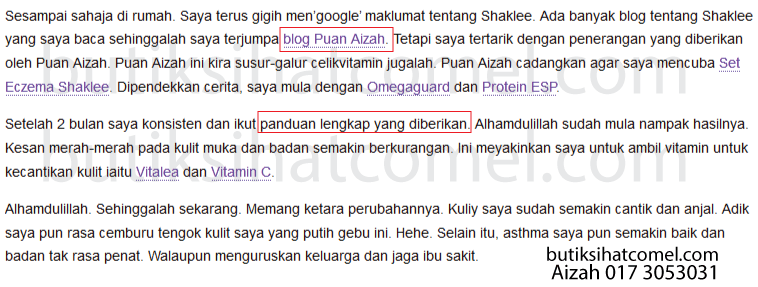 Saya juga seperti pengguna yang lain pada permulaannya, ingin mencari pengedar shaklee yang bukan jenis touch n go, di mana kita membeli barang dan terus ditinggalkan tanpa memberi konsultasi dan tips-tips yang diperlukan untuk proses pemyembuhan yang sempurna.