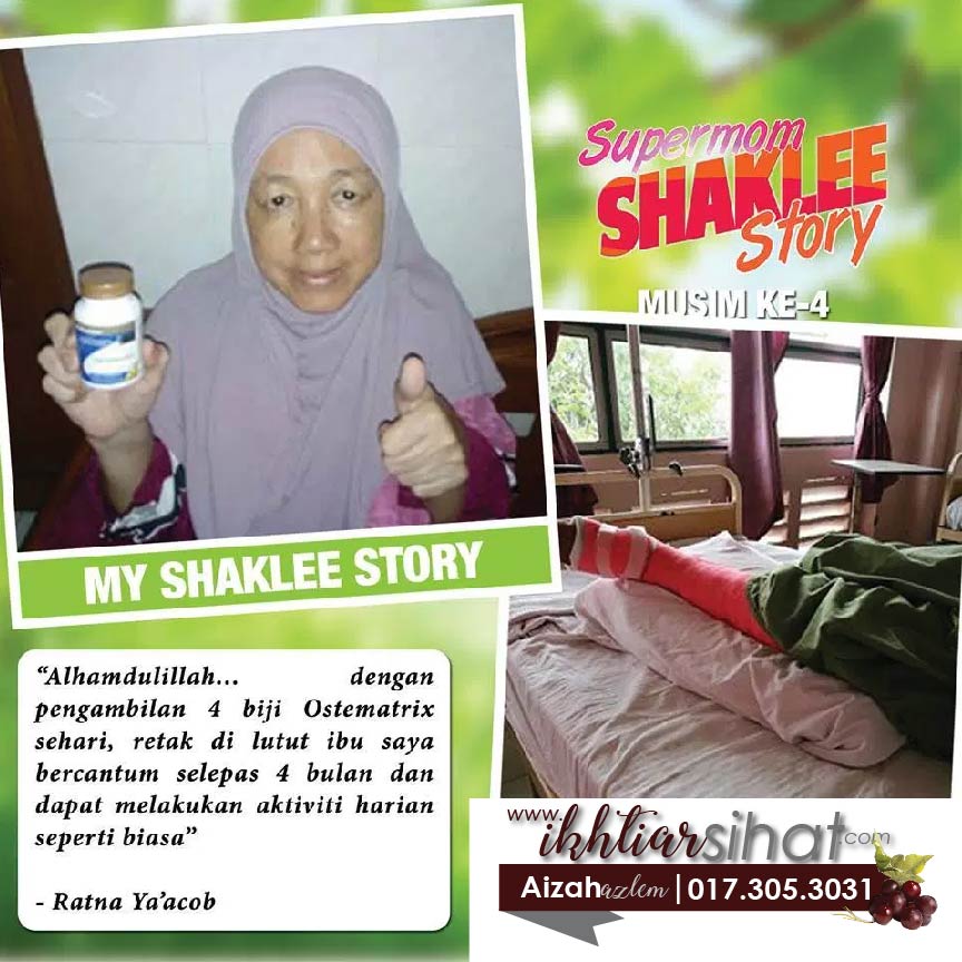 Jadi aizah sangat cadangkan pada semua yang alami masalah tulang retak , ikhtiar dengan 4 vitamin ini dengan konsisten . Dia telah terbukti membantu masalah tulang retak . Daripada kita menahan sakit terlalu lama dan juga menghalang pelbagai aktivit harian kita, ikhtiarlah dengan set tulang retak shaklee ini . In Shaa Allah .