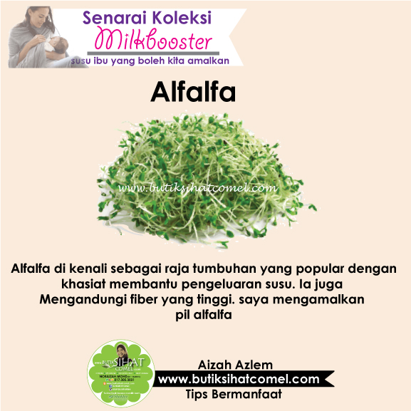 Maklumat lanjut lagi mengenai alfalfa , alfalfa ini memang terkenal dengan penggalak pengeluaran susu , Kini tidak susah-susah mencari pokok alfalfa , kerana sudah ada vitamin alfalfa .